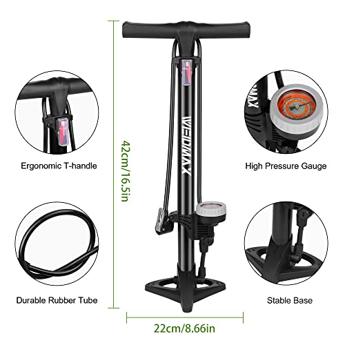 ✔【Powerful & Widely Applications】- Compatible to Universal Presta and Schrader valves, WEIDMAX universal air pump can inflate for bicycles, electric vehicles, motorcycles, air cushion, swimming ring, basketball, football, life buoy, air bed, and any inflatable balls toys;