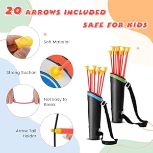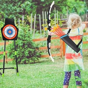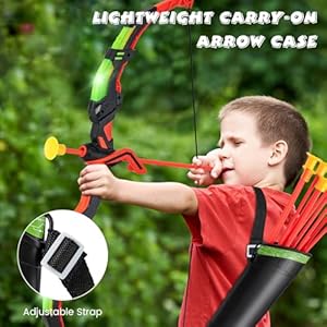 【Indoor & Out of doors Fun】This bow and arrow set is ideal for both indoor and Out of doors use such as home, lawn, park, and so forth. And the complete toy archery set is lightweight, so kids can take this set anywhere and play wherever they would like. Plus, the portable quiver with adjustable strap ensures hassle-free transportation.