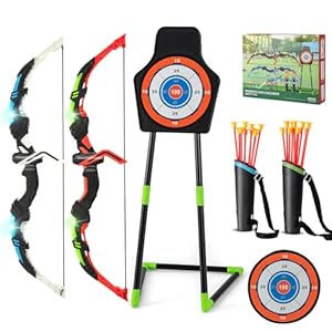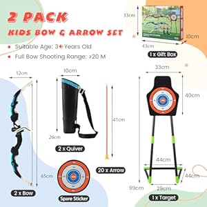 【2-Pack Shooting Game Set】The archery bow set includes 2 bows with LED lights, 20 arrows, 2 quivers, 1 spare sticker and 1 shooting practice target. With this comprehensive archery set, young players will have an immersive and exciting gaming experience. The detachable stand target offers 2 how one can play, use it as a hanging target on the wall or a standing target on the floor.