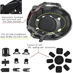 Includes: 1XFAST helmet, a set of helmet accessories (9 pieces), EVA helmet lining kit, 1X goggles and a pair of tactical masks. The helmet is made of high-quality durable materials. There are 9 adjustable EVA loads inside.