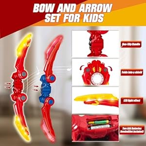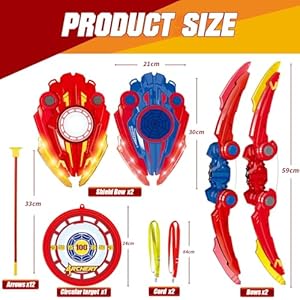 VALUE ARCHERY KIT: LED remove darkness from archery toy package includes 2 bow bodies, 12 suction cup arrows, 1 target. Every bow requires 2*AAA batteries (not included). Two player competition adds to the game experience. An excellent toy for 4 5 6 7 8-12 year old boys.