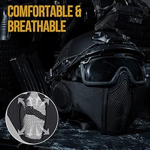 【Durable Combat-In a position Construction】The main body of the helmet is made of high-quality engineering plastic ABS; The foldable half-face airsoft mesh mask with ear protection is made of low-carbon metal mesh and 1000D nylon. Tested at 800FPS affect resistance at a temperature of -10°C to 42°C; The tactical goggles frame is made of thermoplastic polyurethane and elastic rubber (TPU) and the lens is made of PC material.