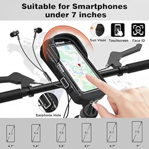 UNIVERSAL FOR PHONES UNDER 7″ – The newest bike phone mount fits cell phones under 7 inches! Most bike bags on the market is 6 or 6.5inches, which is too small for big phones. Compatible with mobiles such as iPhone 13 Pro, 12 Pro Max, 12 Pro, 12, 11, Xs, XR, X, SE, 8; the Huawei P30 Pro, 10 Pro, Mate 40 Pro, P20 and P10; the Samsung Galaxy A12, A31, A21s, S21+, S21, S21 Ultra, S10+, S10, S9+, S9, S8+; the Redmi Note 9, 9a and 9; LG, HTC, Sony, Nokia and other smartphones