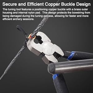 Secure and Efficient Copper Buckle Design: The tuning tool features a positioning copper buckle with a brass outer housing and internal nylon pad. This design protects the bowstring from being damaged during the tuning process, allowing for faster and more efficient archery sessions.