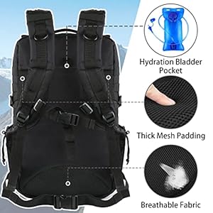 - Features: Ventilated thick mesh padded shoulder straps and back area, adjustable waist belt, sternum strap, dual compression straps, water-resistant material, heavy-duty zippers